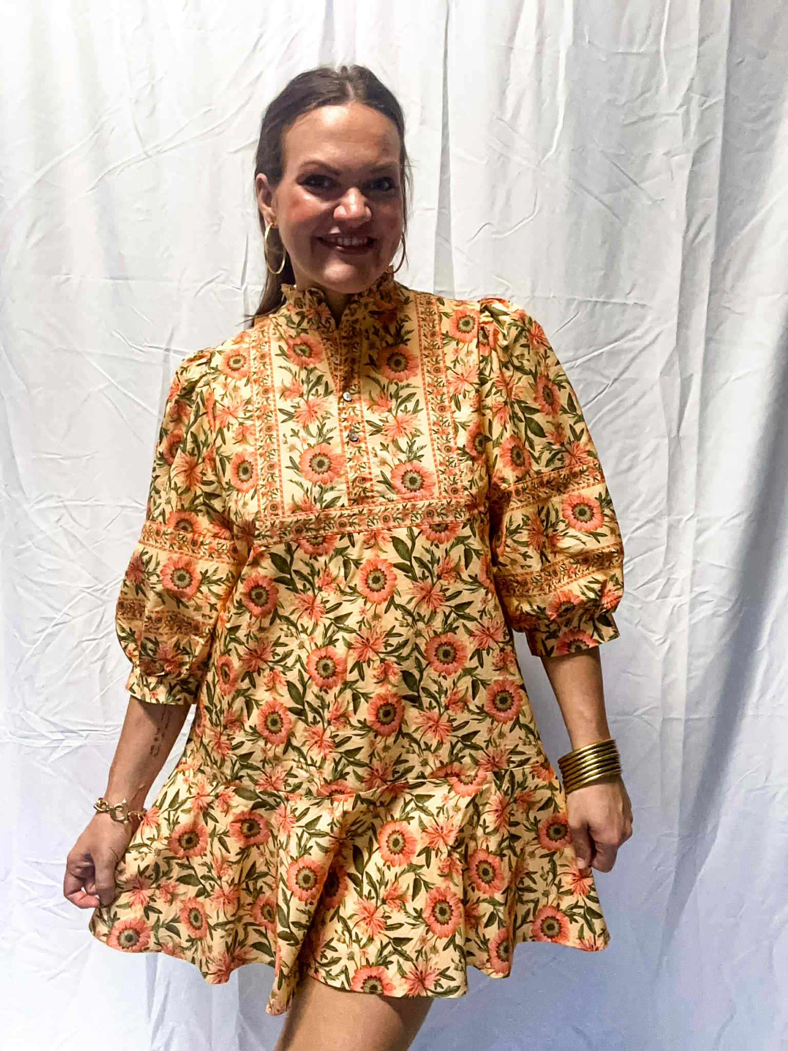 Turn heads in this golden floral mini dress that radiates sunshine and charm. Featuring a playful ruffle hem and a flattering, flowy silhouette, this dress is perfect for brunch dates or fall outings. The warm golden hue paired with delicate floral details gives it a feminine yet effortless vibe.
